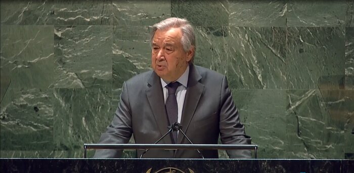 دبیر کل سازمان ملل متحد افزود: این جنگ که از هوا، زمین و دریا جریان دارد باید هم اکنون خاتمه یابد. بمب ها و موشک های روسیه روز و شب مشغول هدف قرار دادن اوکراین بوده است. کی یف از همه طرف محاصره شده است. ساکنان کی یف مجبورند در خانه ها، پناهگاه ها و ایستگاه های مترو پناه بگیرند. دولت اوکراین در میان جمعیت این کشور سلاح توزیع کرده است تا در امر دفاع شرکت کنند.حدود نیم میلیون اوکراینی مجبور به فرار از این کشور شده اند.